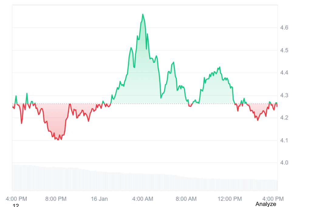 从日线图来看,ICP价格遵循了一个熟悉的模式。价格早盘下探,并在4.10-4.15美元区域附近找到支撑。随着动能恢复,ICP价格加速上涨,一度推高至4.60美元中段,随后买盘力量耗尽。