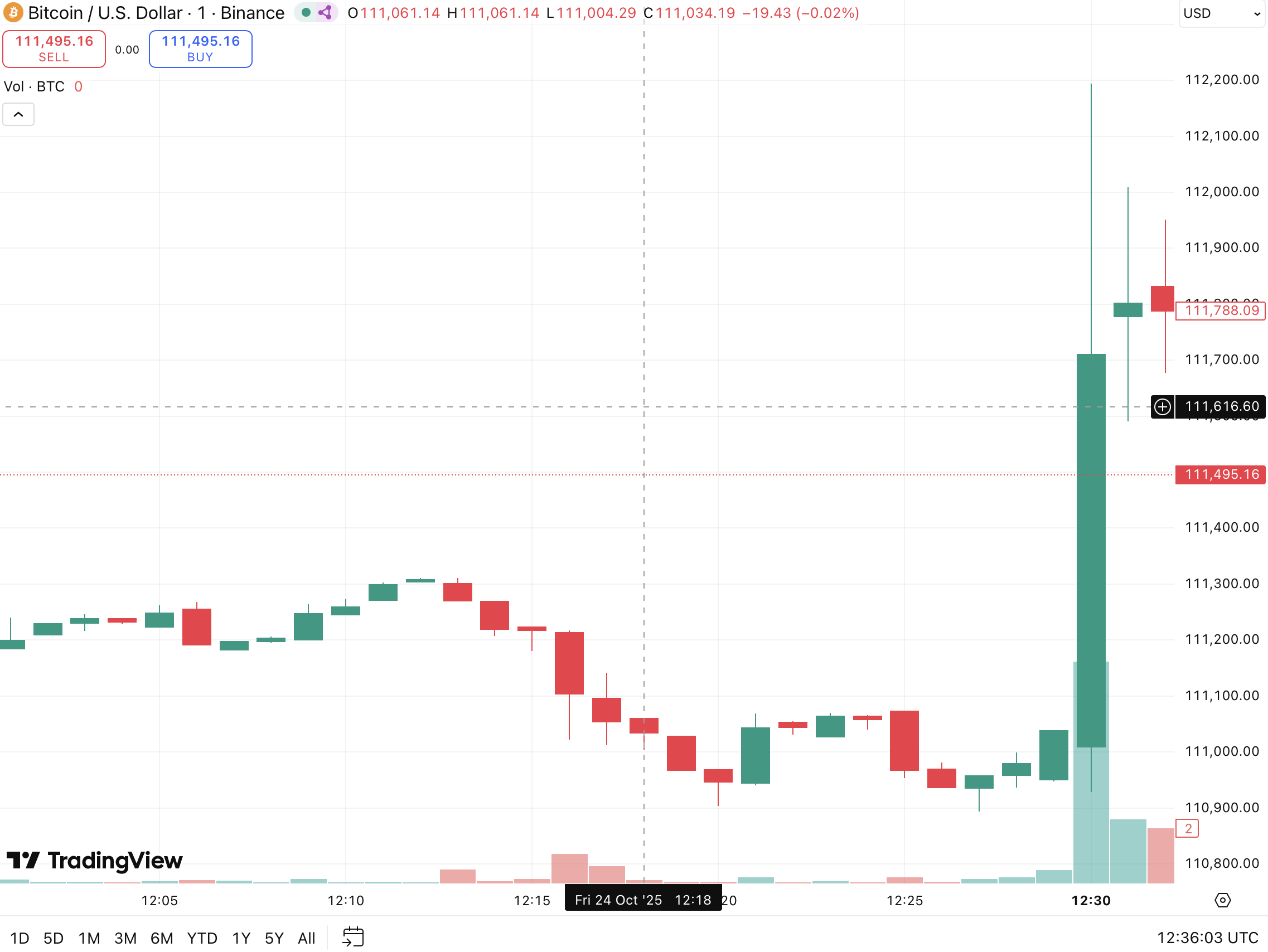 市场对此数据反应迅速。报告发布前横盘整理的比特币,在UTC时间12:30数据公布后立即出现剧烈波动。图表显示BTC先下探至111,000美元附近,随后几分钟内强势反弹至近111,900美元。