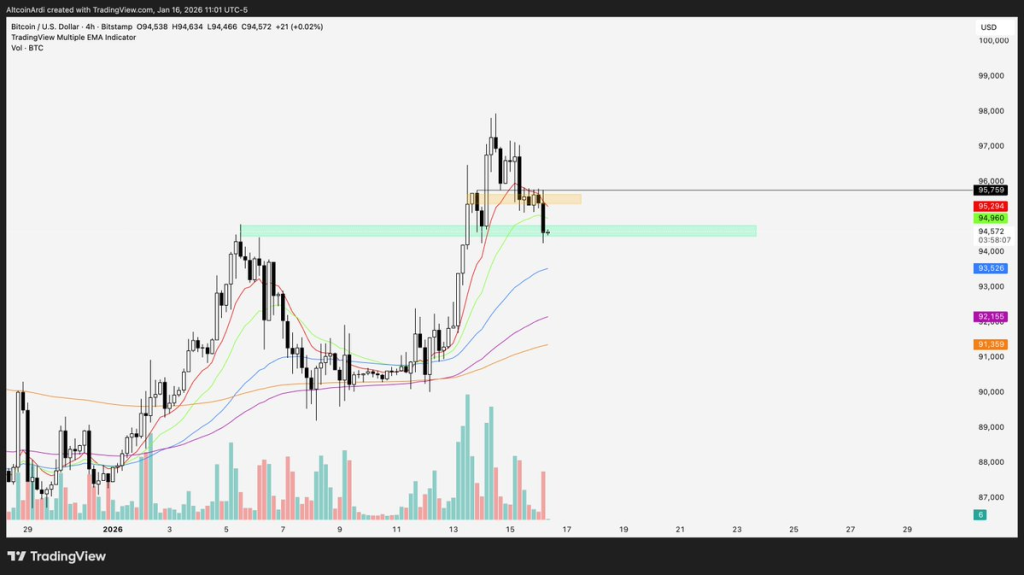 在4小时图中,比特币跌破了95,200美元,并触发了快速下探94,500美元区域的走势。该水平此前一直作为支撑位,当前的价格走势正在测试先前盘整区间的基底。该区域标志着早前突破的起点,并可能影响下一步走势。