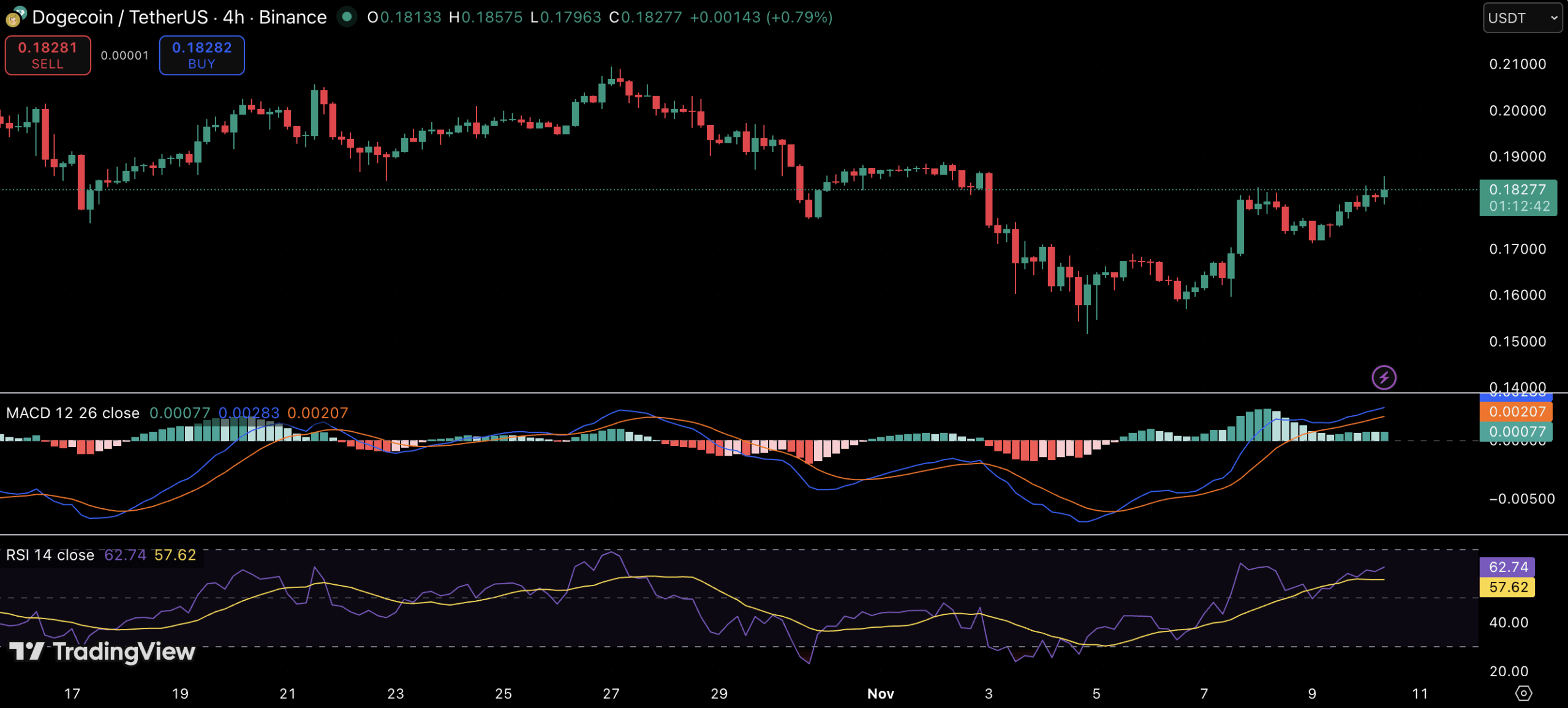 技术面来看,币安4小时图显示MACD转正、柱状图上升、RSI向超买区攀升,这些指标共同预示着价格可能尝试收复0.19-0.20美元区间。