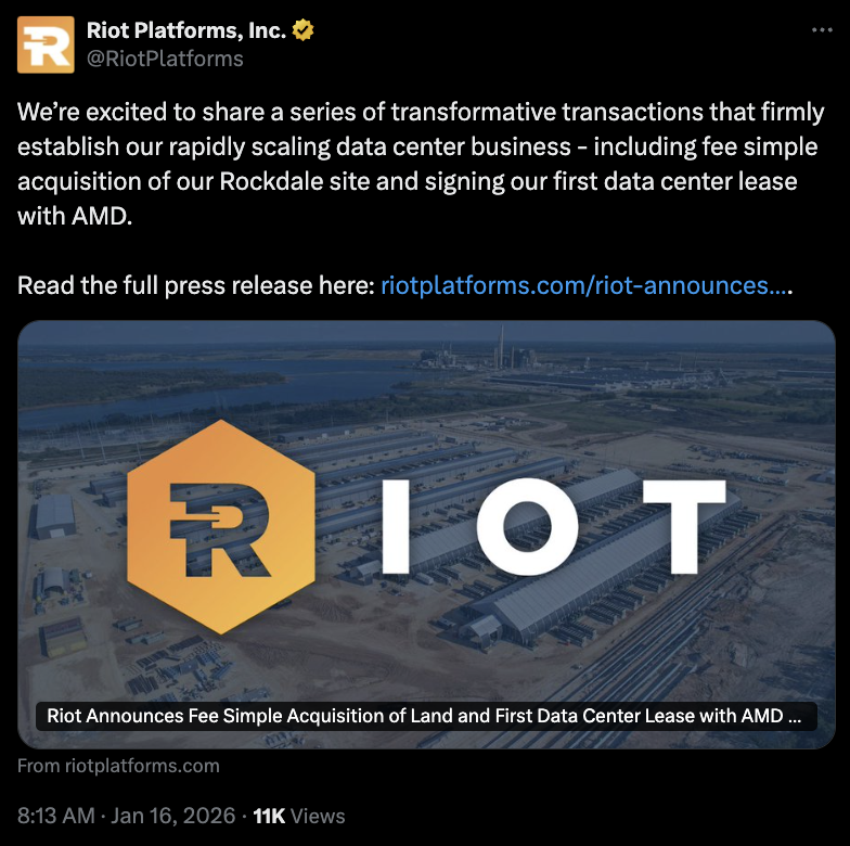根据周五公告,Riot以9600万美元价格购得德克萨斯州罗克代尔市200英亩土地,资金完全来自出售约1080枚比特币(BTC)。该公司还与半导体企业Advanced Micro Devices(AMD)签署了数据中心租赁与服务协议,初步部署25兆瓦的“关键IT负载容量”。
