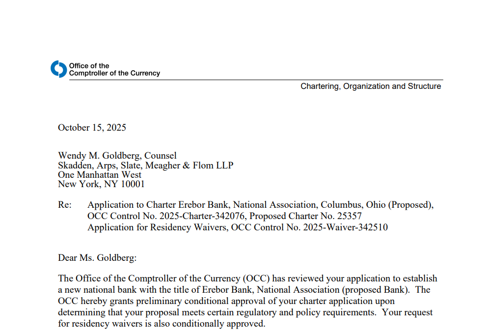 美国货币监理署今日宣布,批准位于俄亥俄州哥伦布市的埃瑞博银行获取国家银行特许执照的申请。经过严格审查后放行,该银行正式获得由帕尔默·拉奇与彼得·蒂尔支持的加密银行资质。货币监理署署长乔纳森·V·古尔德表示: