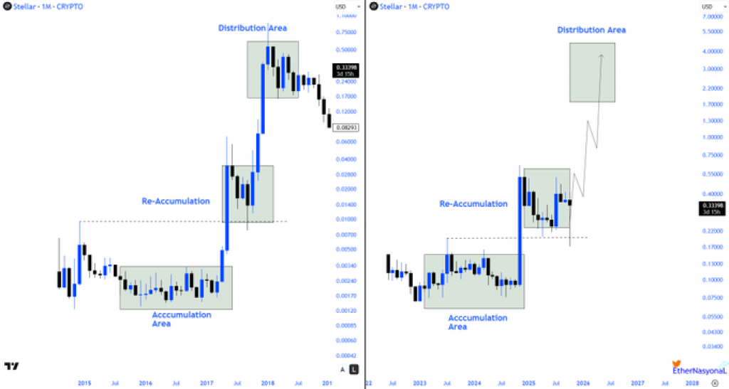如果恒星币(Stellar)的K线图此刻需要配乐,那必然是2017年走势的混音版本——这是市场研究员EtherNasyonaL深度分析的核心观点,其精妙的威科夫对比图表清晰呈现了当前结构与上一轮周期的相似性。关键信号简明扼要:漫长的静默吸筹、稳健的二次蓄力,最终迎来引爆市场的突破。若节奏延续,下一乐章将是万众期待的扩张行情。