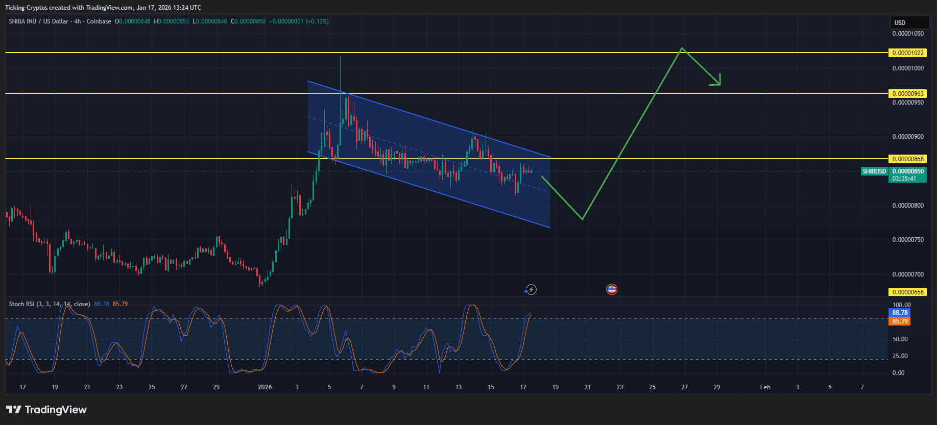 Shiba Inu($SHIB)在2026年初呈现技术性复苏与生态驱动的乐观情绪交织的局面。经历了动荡的2025年后,SHIB价格近期显现生机,于1月第一周内飙升近25%,触及0.00001017美元高点。然而,市场仍然是散户期望与鲸鱼主导清算之间的"战场"。
