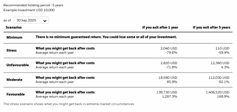 在投资模型方面,贝莱德提供了详尽的盈亏情景分析:在最坏情况下,1万美元投资可能全部损失;而最佳情景下,持有5年可实现超140万美元收益,持有1年也有138,730美元回报。