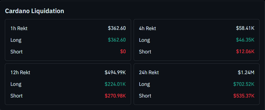 这表明在ADA未能维持上涨动能时,许多押注价格上涨的交易者面临重大损失。相反,空头头寸清算量达53.537万美元,显示看跌交易者也承受一定压力。