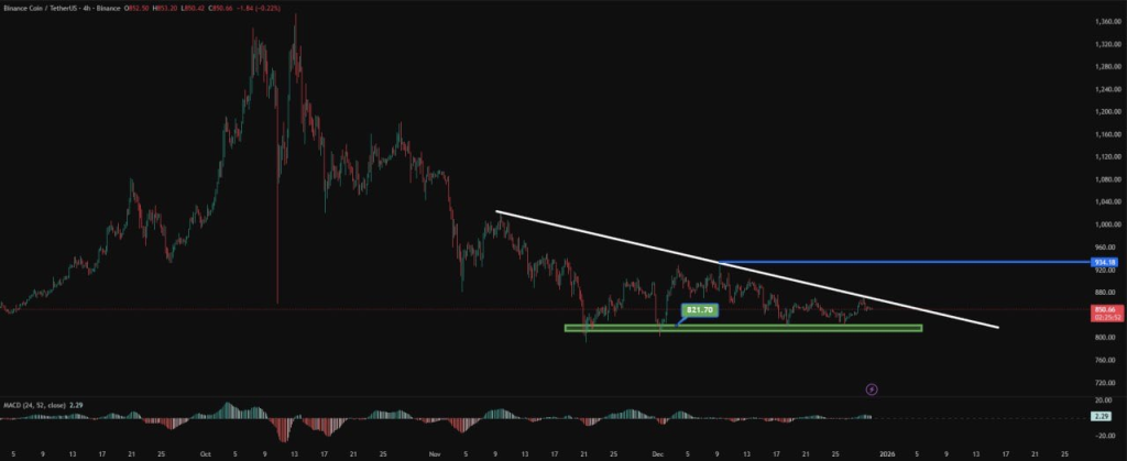 不过要实现确认的看涨趋势,BNB必须突破934.18美元的关键阻力位。若能成功突破,市场结构有望转向积极态势。若未获确认,市场可能维持中性格局或延续震荡行情。