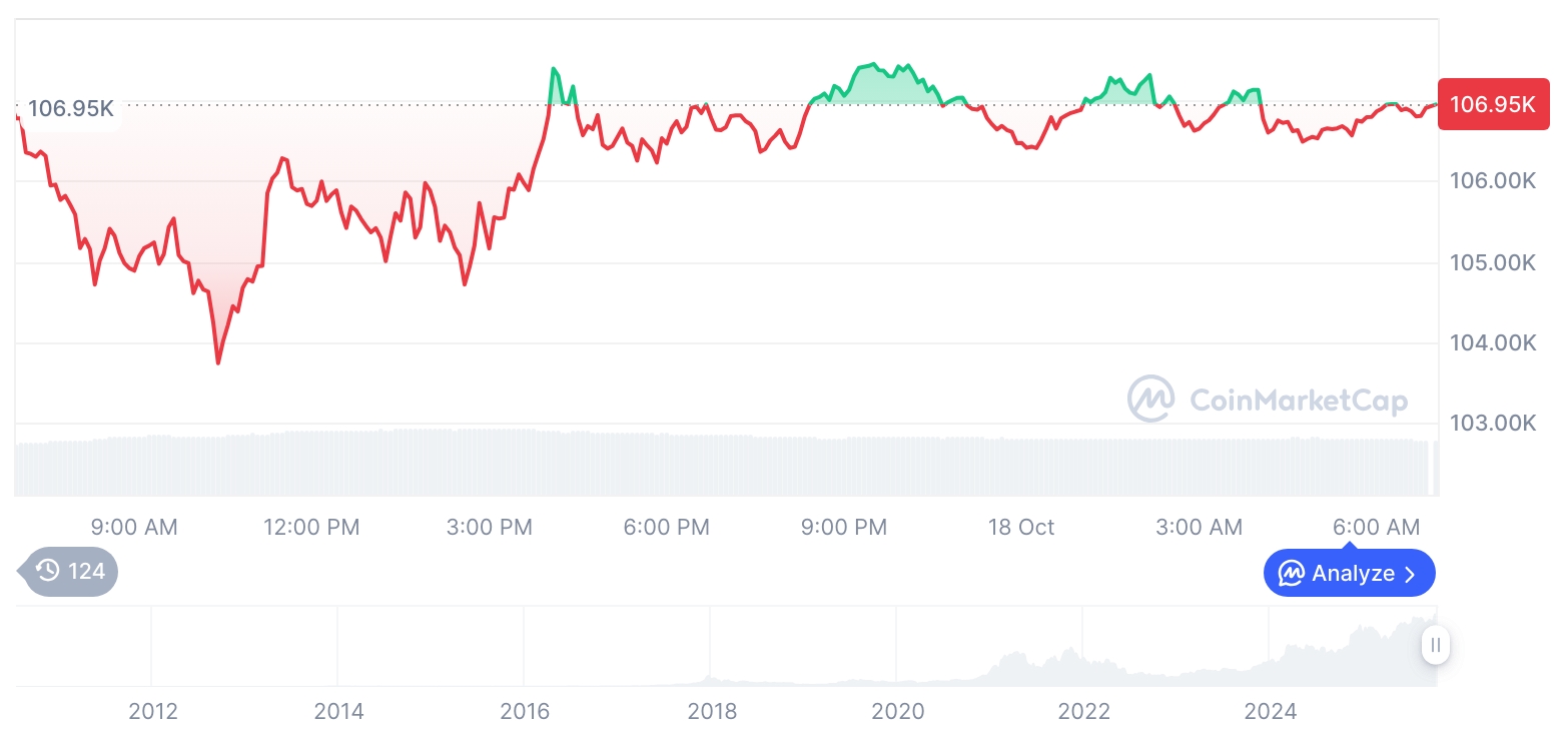 据数据显示,比特币现报107,123美元,单日成交额超960亿美元。过去24小时下跌0.68%,周跌幅达8.67%,延续了上月高点以来的跌势。随着波动性收窄和市场流动性下降,交易者普遍保持谨慎。