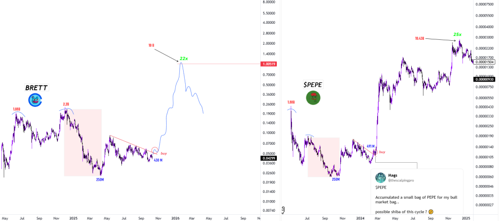 Mags发布的详细分析显示,PEPE和BRETT从早期阶段就呈现出近乎复刻的价格轨迹。PEPE曾从低位启动,经历数月横盘整理后,在突破关键点位后实现25倍暴涨。Mags指出,BRETT可能正在构筑相同的上涨结构。