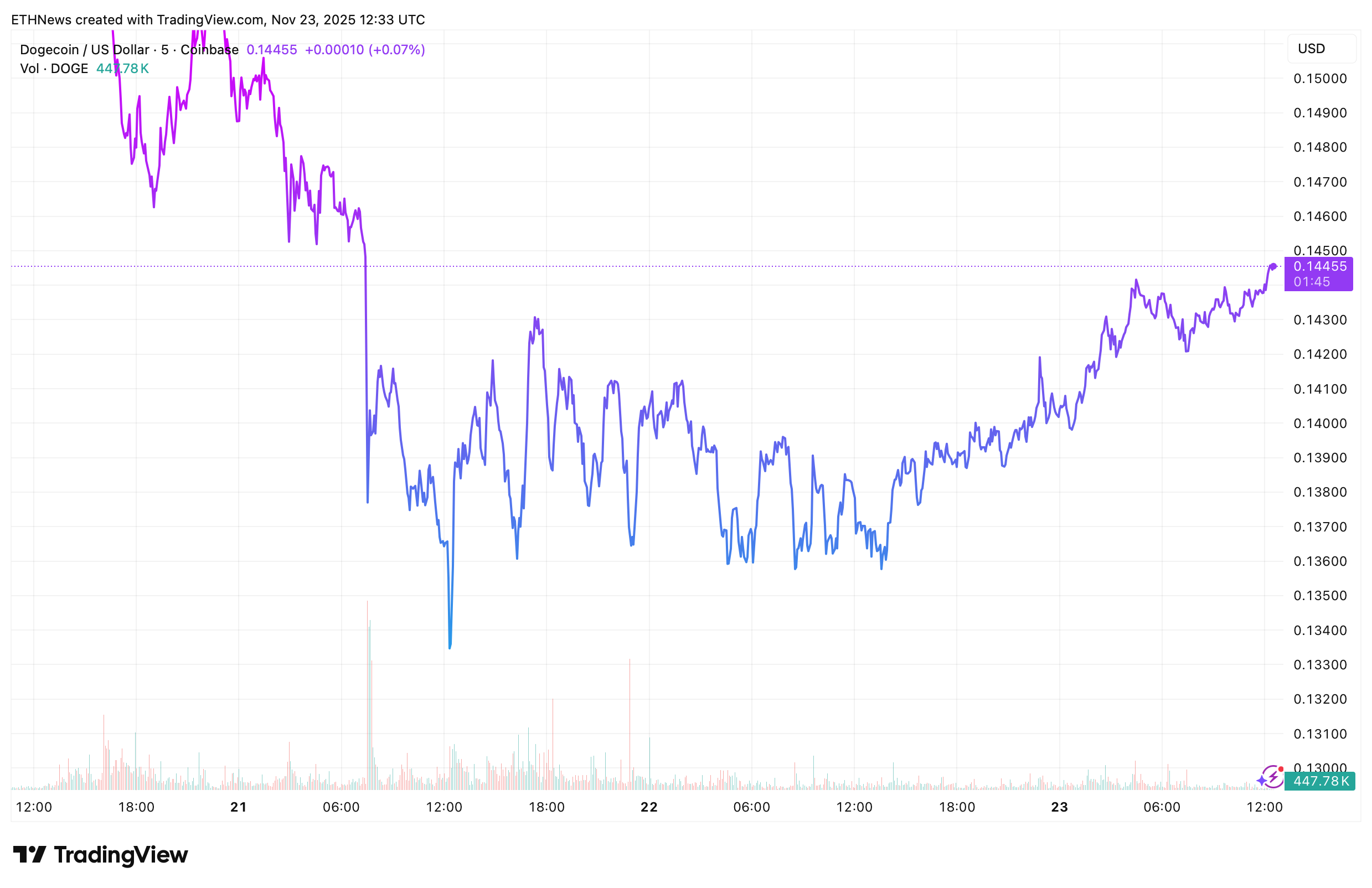 尽管市场环境谨慎,但TradingView短期图表显示DOGE已从0.136-0.138美元支撑区间启动稳步日内反弹,该区域历史上曾多次形成有效支撑。