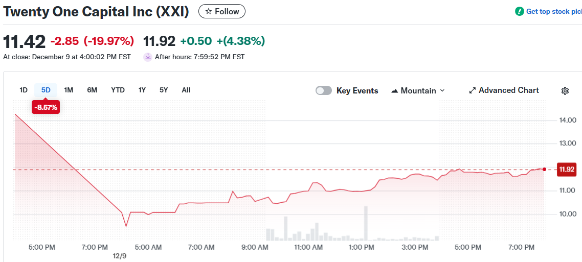 周二,Twenty One Capital在公开市场的首秀表现不佳。股价收于11.42美元,较其合并的SPAC公司Cantor Equity Partners的收盘价14.27美元下跌了20%。
