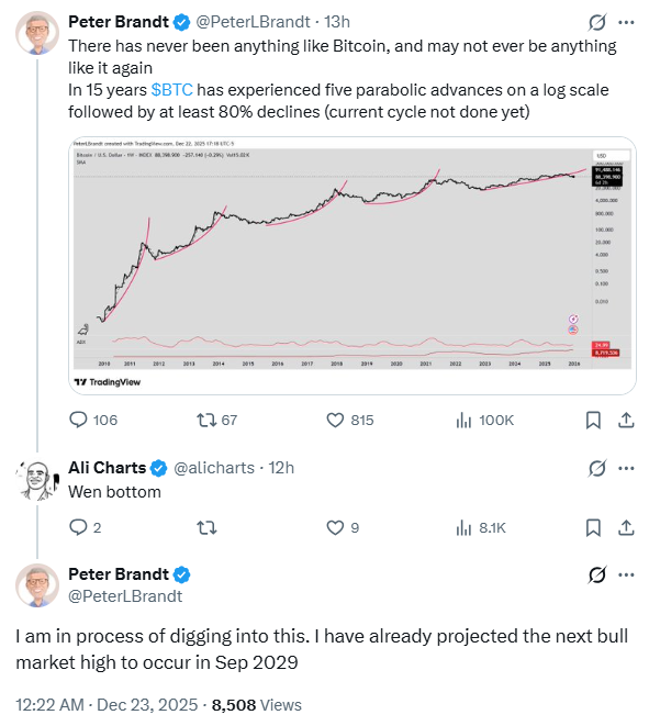 Brandt认为当前市场周期仍在延续,并解释称此次下跌可能尚未触及最终低点。在回应其他分析师提问时,他表示仍在复核数据,但确认其长期预测指向下一轮牛市高点将出现在2029年9月前后。