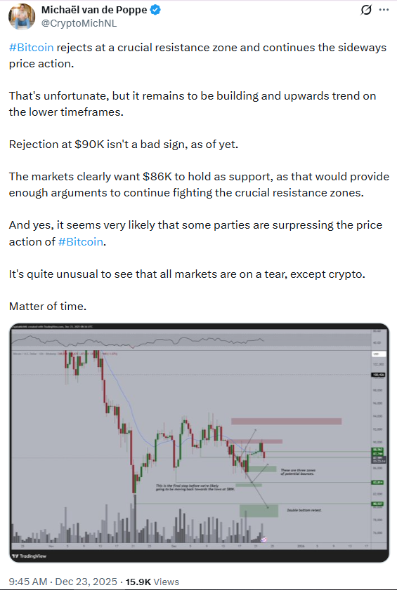 Michaël van de Poppe指出,比特币价格在90,000美元附近遇阻后,86,000美元成为关键支撑位。