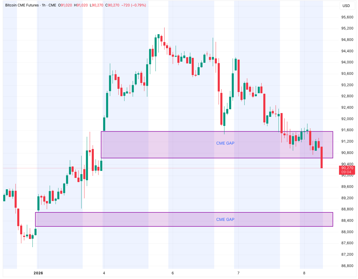 市场焦点仍集中于芝商所比特币期货市场在新年期间形成的未填补缺口。这些缺口常影响短期价格目标,近期波动已填补其中约89,530美元的缺口。若价格继续下行,下一目标可能位于8.82万美元附近,这与技术预期相符。