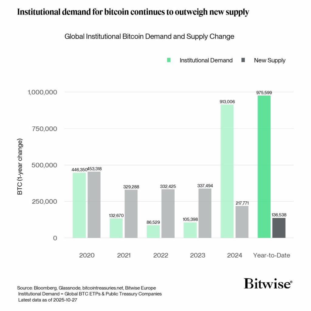 最新统计显示,仅ETF和上市公司今年就已购入97.5万枚比特币,远超矿工13.6万枚的新币产量。这种巨大需求导致供需关系严重失衡,为比特币价格潜在上涨埋下伏笔。