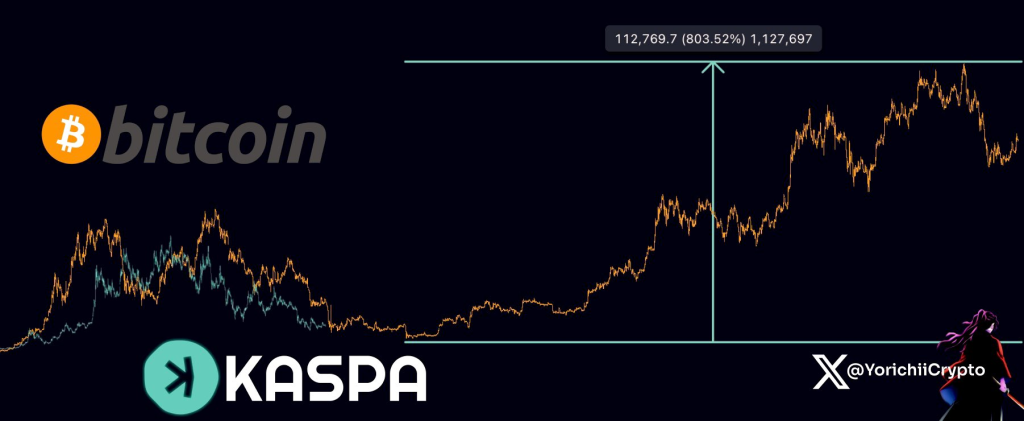 分析师Yoriichi Tsugikuni(X平台账号@YorichiiCrypto)通过对比图表强调,Kaspa当前价格结构与比特币重大上涨前的历史形态高度吻合。图表重点展示了比特币价格如何经历数月的横盘整理、构筑基础并缓慢积蓄动能,最终突破并实现803%的持续上涨。