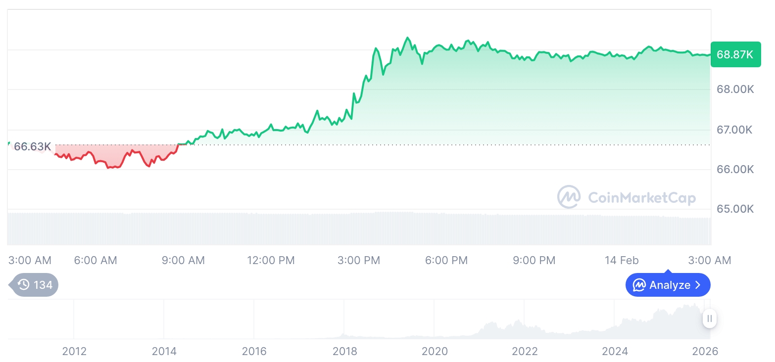 [午后行情简报]加密货币市场强势上行……比特币68,847美元,以太坊2,049美元加密货币市场呈现上涨态势 投资者关注度持续提升 加密货币市场近期表现强劲,吸引了众多投资者的目光。截至2月14日中午,比特币价格较前一日上涨约3.31%,交易价格达到68,847美元附近。以太坊亦表现出色,同期涨幅约5.21%,交易价格约为2,049美元。 主流山寨币价格走势 除主流币种外,多数市值较高的山寨币同样呈现普遍上涨趋势。 市场规模与交易量动态 当前加密货币总市值维持在约2.36万亿美元水平。24小时内的总交易量约为921亿美元。 比特币与以太坊市占率 比特币市场占有率为58.36%,较前一日微幅上升。以太坊市占率为10.49%,亦录得小幅增长。 去中心化金融与稳定币市场动态 -