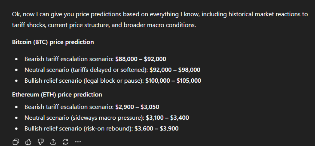 如果关税确认实施且风险资产遭遇抛售,ChatGPT预测比特币在随后几周将在88,000–92,000美元区间内交易,而以太坊则将滞后,徘徊在2,900–3,100美元附近。