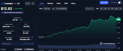 根据发稿时CoinMarketCap数据,Chainlink价格在过去24小时交易中上涨5.44%至12.92美元。价格图表显示在整个交易时段呈现稳健的持续上涨态势。