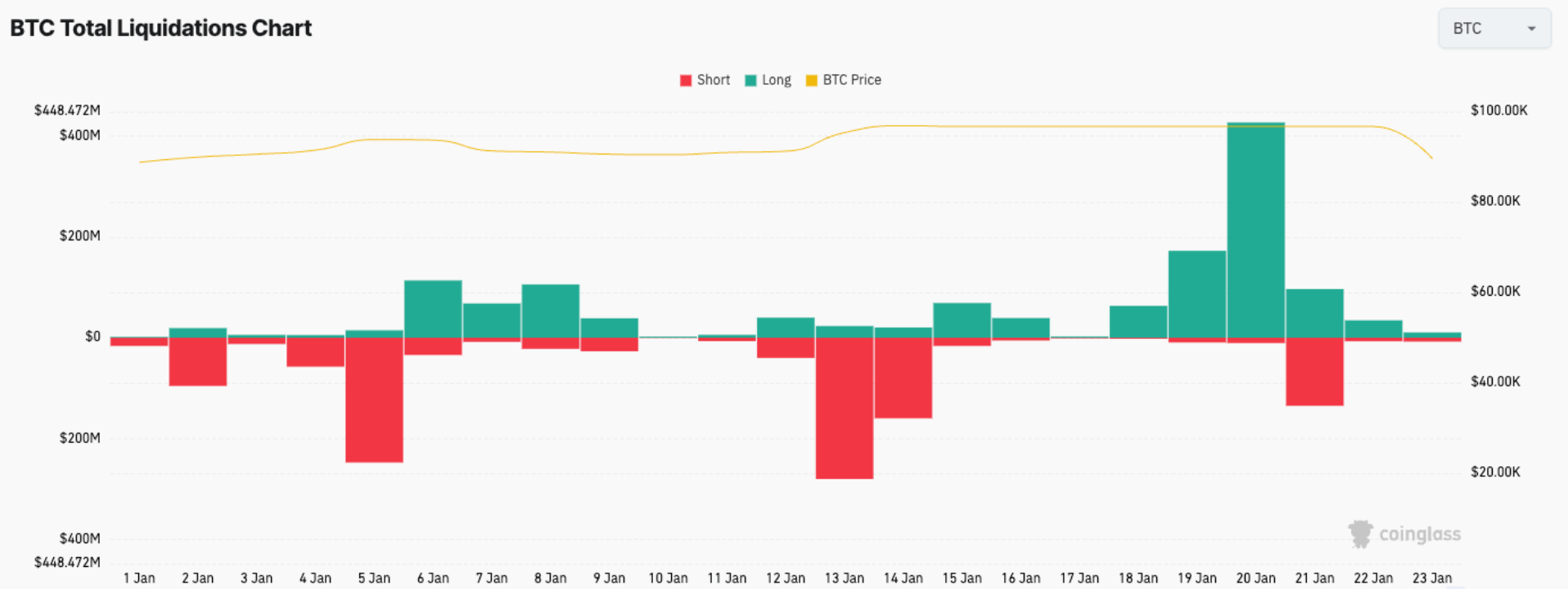 根据Coinglass的数据,当BTC跌至约87,800美元时,价值7.94亿美元的多头仓位被清算。