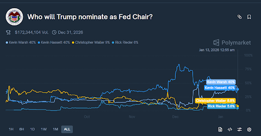 克里斯托弗·沃勒的份额为8.8%,而里克·里德为5.6%。图表揭示了2025年底至2026年初的市场变动。沃什和哈塞特在十月至一月期间呈现显著上升趋势。