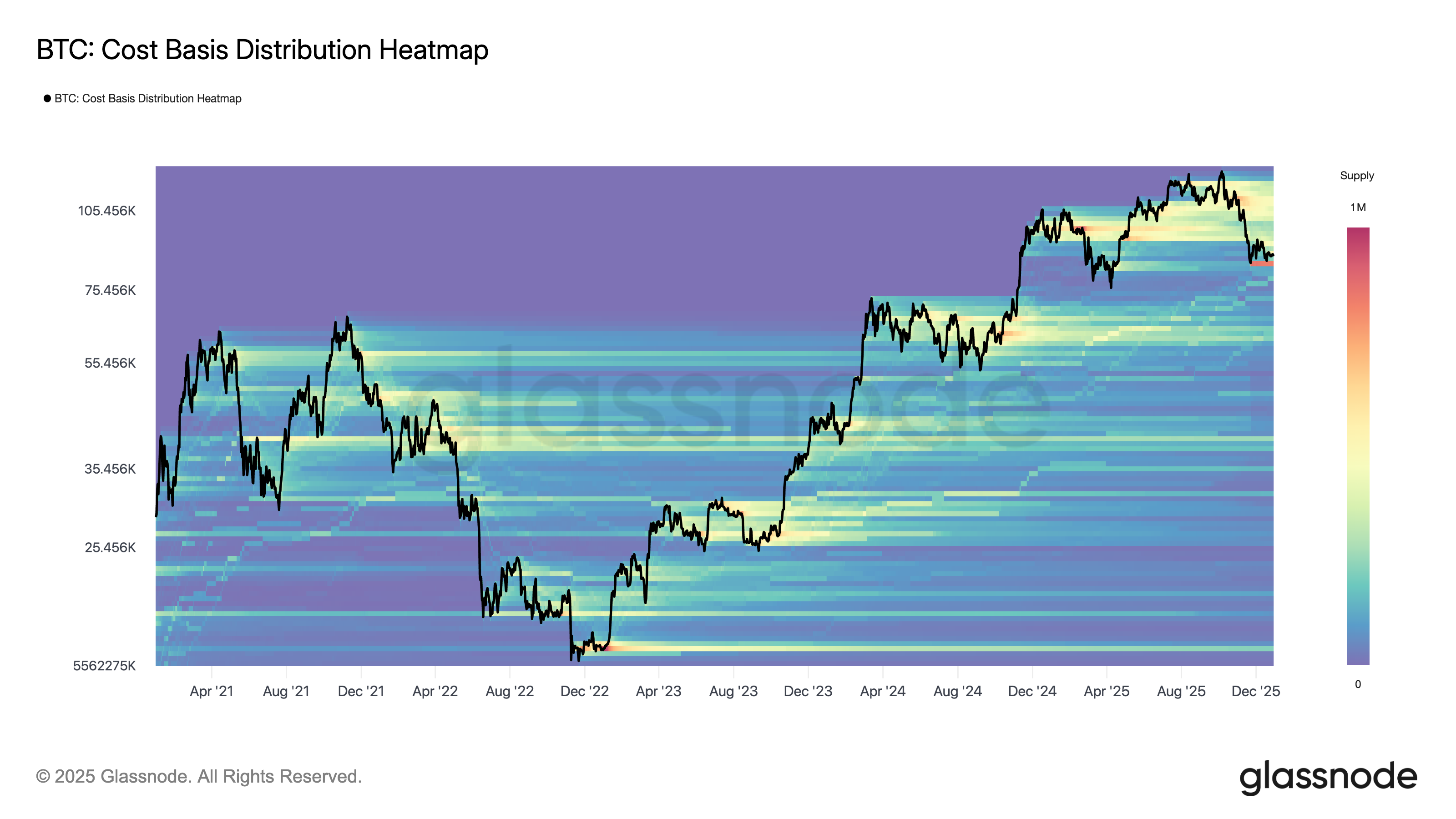 2026年需要关注的下一个图表是比特币的成本基础分布热力图,它显示了在不同价格水平上大量比特币供应的积累区域。