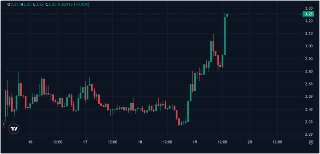 当价格与持仓量同步快速攀升时,通常意味着强势买方入场迫使空头回补。当前关键支撑位在2.96美元,站稳该位置将确认突破的有效性。