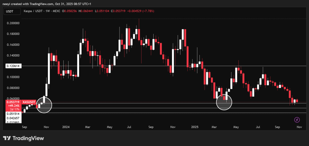 Kaspa现报0.0054美元附近,该位置自2023年11月以来始终扮演关键支撑角色。若有效跌破,可能打开新的下行空间:当市场走弱时,KAS或下探0.04美元区间;更深跌幅将考验0.033美元重要关口。不过观察人士认为转机仍存——若能守住当前支撑,KAS或将再次冲击0.1美元目标位。