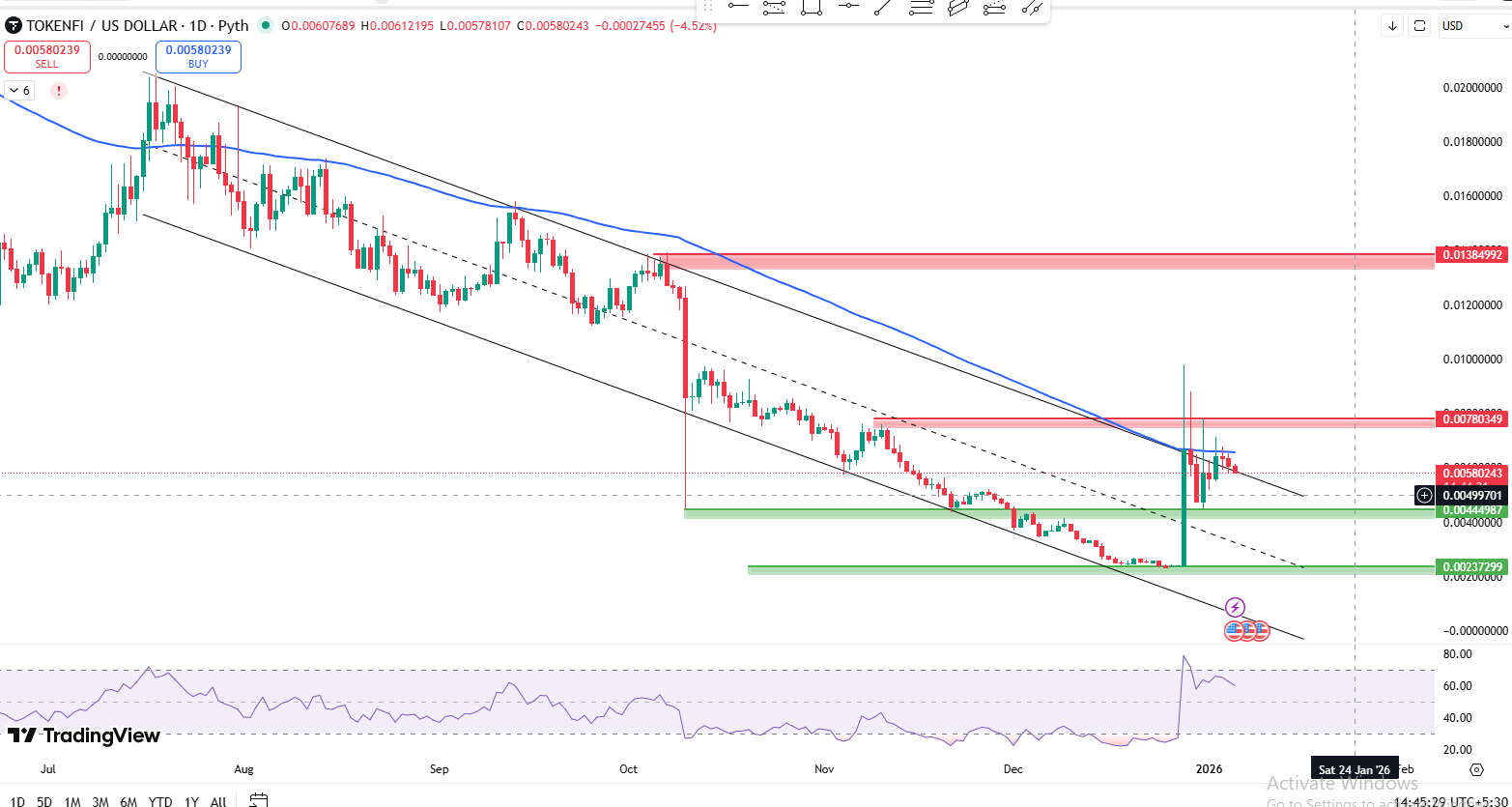 在日线图上,TokenFi曾长期陷于下跌趋势中。价格不断走低,每次反弹均告失败。最终价格被推至0.0020000至0.00250000美元区域,该区域目前构成了强劲的底部基础。随后价格出现了有力反弹,并非弱势反抽,而是有效的市场反应。
