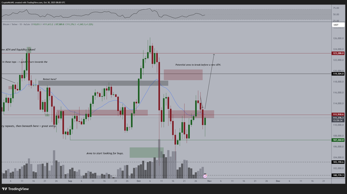 Van de Poppe表示,比特币未能站稳11.2万美元上方并不代表整体上升趋势失效。他重申"回调后形成更高低点"的观点依然成立,并预期当BTC重新突破11.2万美元阻力区后将启动新一轮上涨。