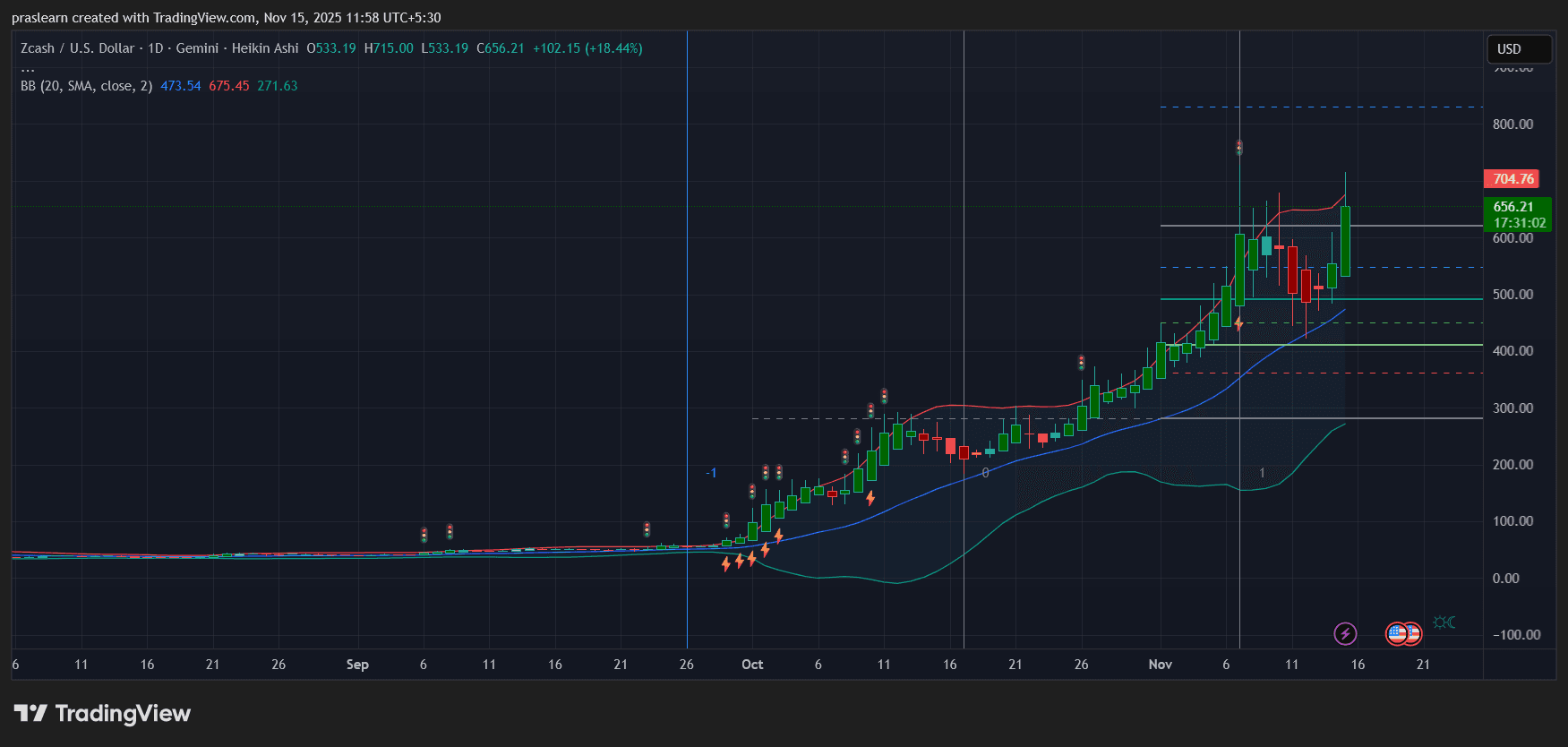 Zcash走势图展现的并非单纯冲高,而是趋势的构建。自9月下旬以来,ZEC始终沿移动平均线稳步上行,紧贴布林带中轨后强势突破。11月波动率虽扩大,但即便冲高700区域后的回调也显得克制而非恐慌。