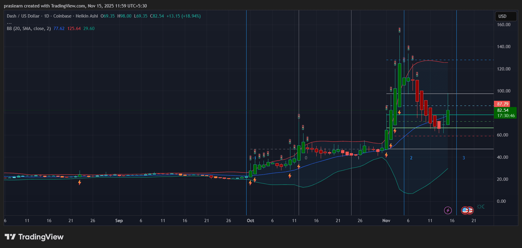Dash需有效收复95-100关口,动量交易者才会重新重视。这是市场是否原谅其崩盘的首个真实考验。突破100后或有望挑战115-120,但该路径布满早期被困买家的阻力。