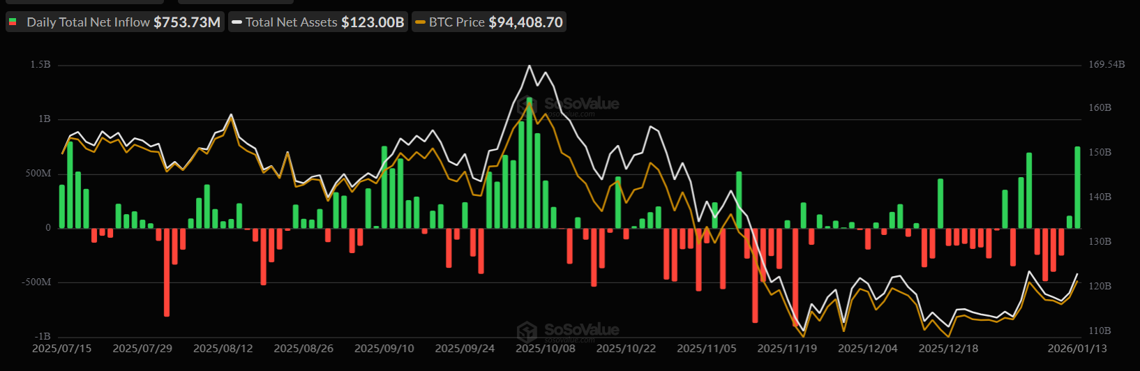 根据SoSoValue数据,1月13日美国比特币ETF实现连续第二日资金净流入,单日规模超7.537亿美元,其中富达比特币ETF(FBTC)资金流入量最为显著。昨日成为自2025年10月7日以来比特币ETF资金流入最高交易日,当时流入规模突破8.75亿美元。1月12日这些加密产品亦录得超1.166亿美元资金流入。
