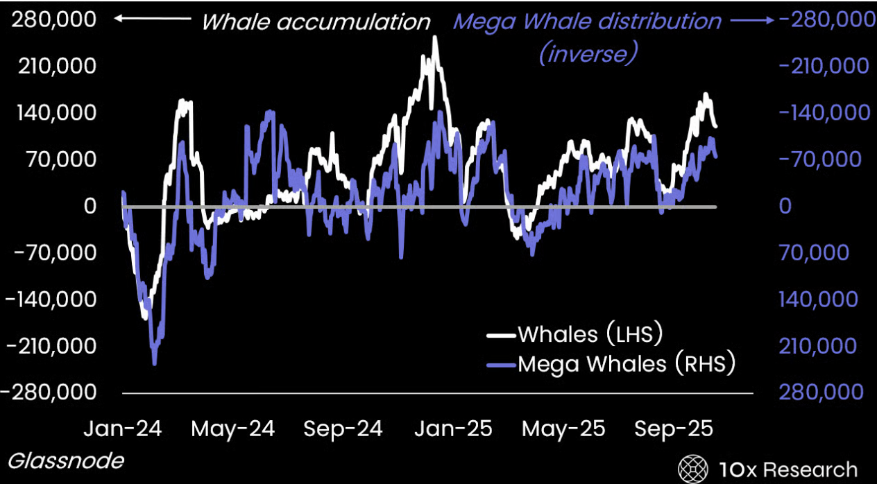 第二个(或许更具结构性)的压制力量来自早期钱包的持续抛售,这些钱包中许多存放着价值数十亿美元的老币。10x Research数据显示,这些钱包的抛售量恰好匹配ETF流入规模,形成自我稳定机制。