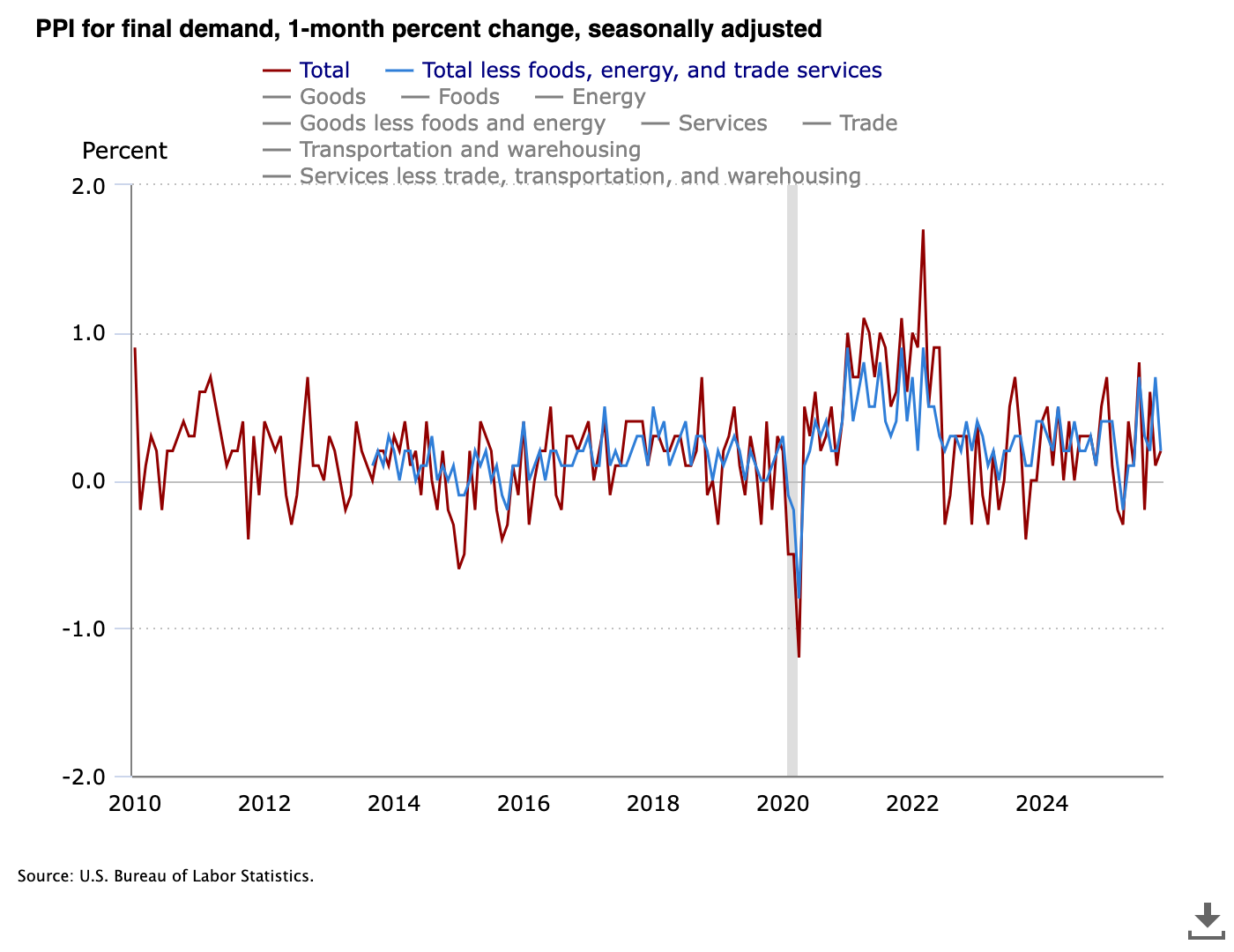 尽管11月生产者价格指数(PPI)显著高于预期,但在美国传统金融交易时段买盘回归的推动下,BTC/USD与传统股市走势出现分化。美国劳工统计局确认,2025年11月PPI与核心PPI同比增长3%,高于预期的2.7%。官方声明指出:“最终需求价格上涨主要源于商品指数0.9%的增幅,服务价格未发生变化。”