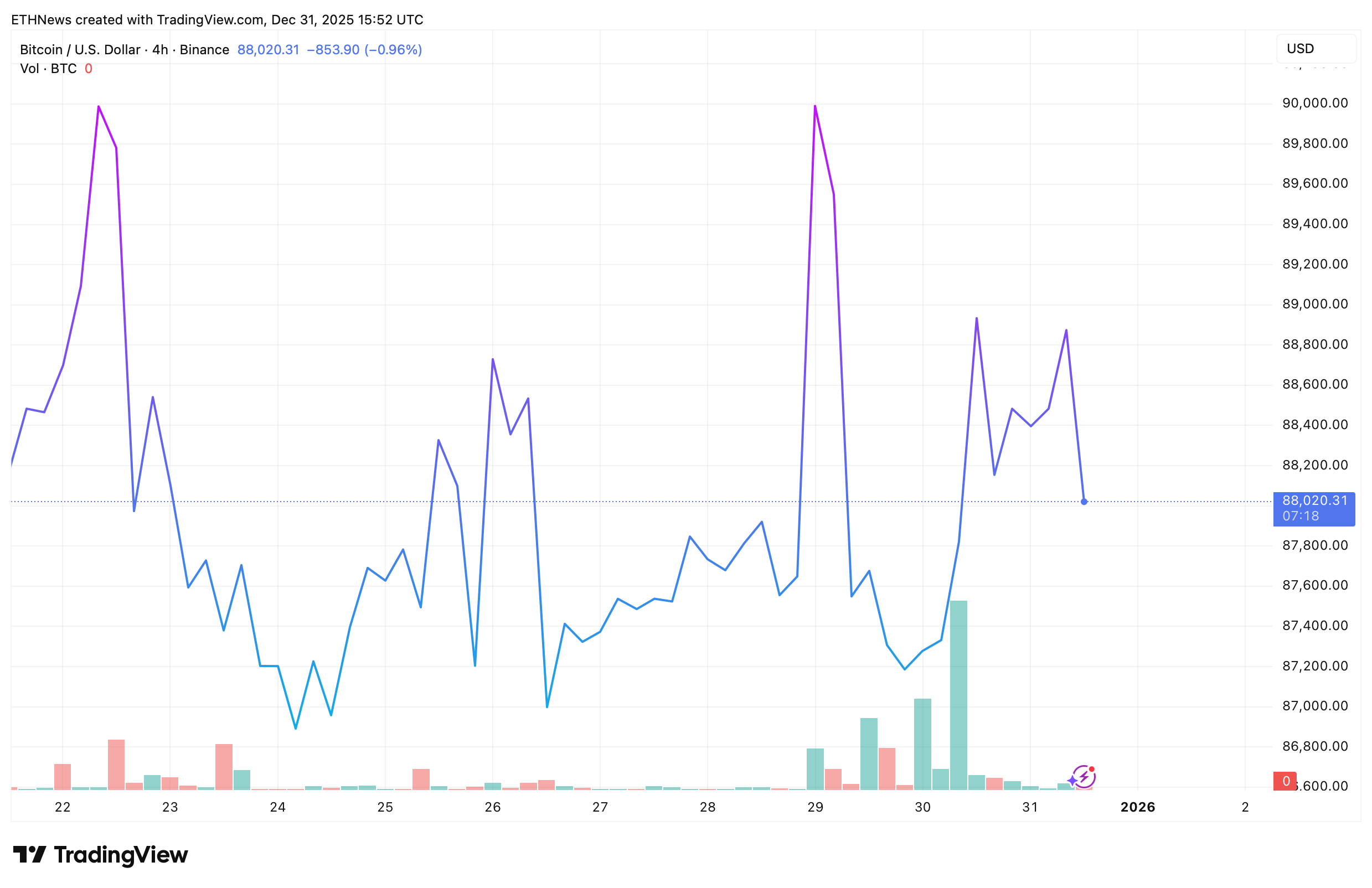 在 TradingView 的4小时图表(币安数据)中,比特币于2025年12月31日15:52 UTC报88,020美元,日内下跌0.96%。尽管盘中数次出现剧烈波动,价格始终未能站稳高位。