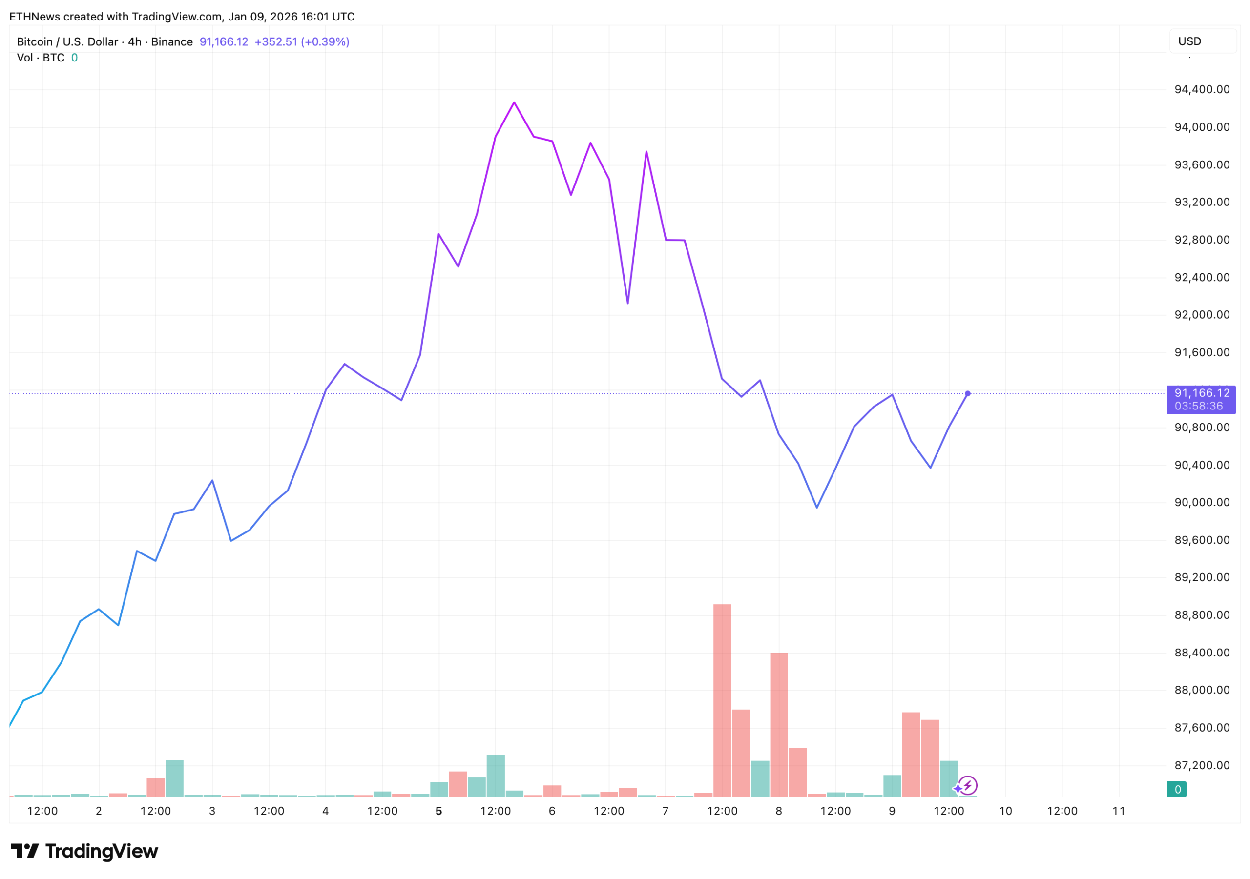 截至发文,比特币在四小时图表上交易于91,166美元附近。价格在早前从90,000美元低点区域反弹后,目前稳定在上升支撑线上方。此次回升是在从94,000美元中段区域回调后出现的,彼时上涨动能停滞,卖方曾短暂占据主导。