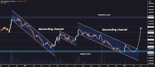 虽然当前市场数据显示价格表现消极,但市场分析师已发现潜在变化。根据观察,FLOKI价格图表显示价格在下降通道内运行。FLOKI价格持续在顶部阻力区和底部支撑区之间反弹。