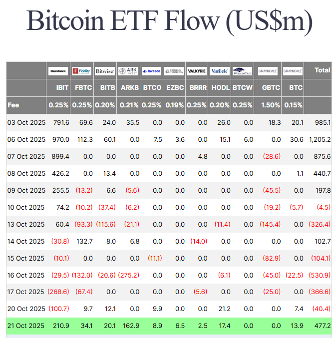 最新资金流向数据显示,美国比特币现货ETF重现资金净流入态势,表明机构投资者对比特币的兴趣正重新引起交易者关注。更令市场振奋的是,10月21日首次实现零流出纪录——此前连续五日净流出的贝莱德IBIT基金也在前一个交易日转为净流入。