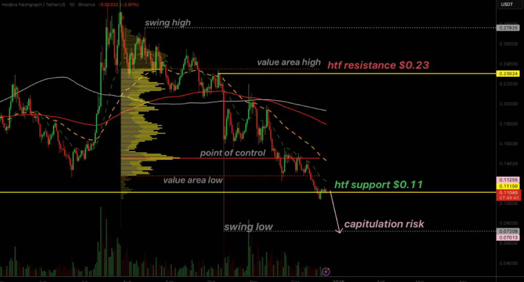 HBAR仍处于关键成交量水平下方,这强化了卖方的控制力,并确认了价格在较低区间获得市场价值认同。0.11美元支撑位至关重要;一旦失守,可能引发流动性驱动的急剧下跌。