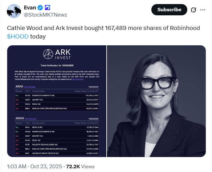 2025年10月22日,方舟投资公司通过两只ETF总计买入167,489股Robinhood股票。