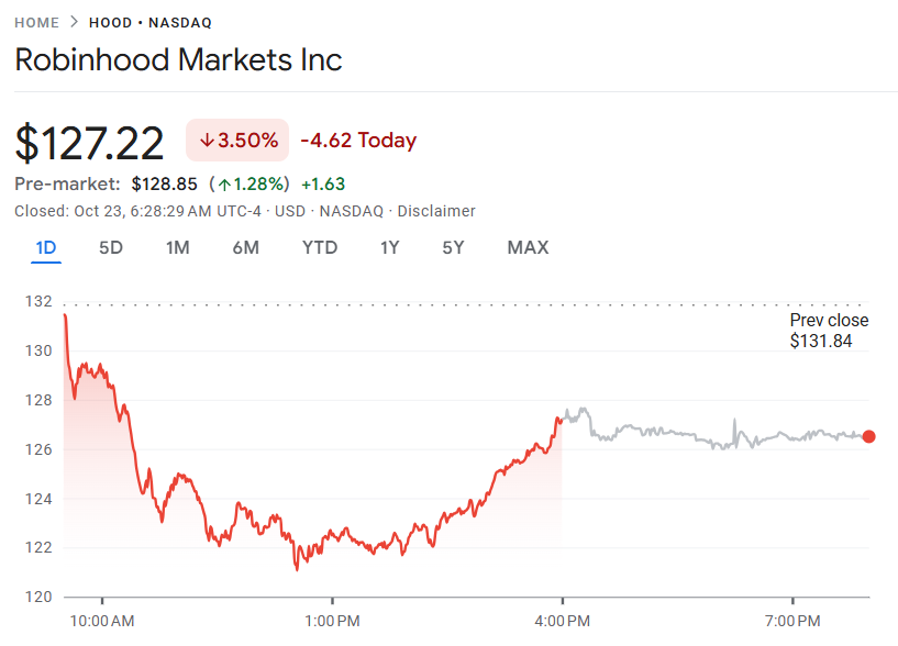 截至10月22日收盘,Robinhood股价报127.22美元,当日下跌3.5%。盘前交易中该股曾触及128.85美元,涨幅1.28%。目前公司市值达1130.6亿美元,市盈率为64.84倍,52周股价波动区间为23-153.86美元。