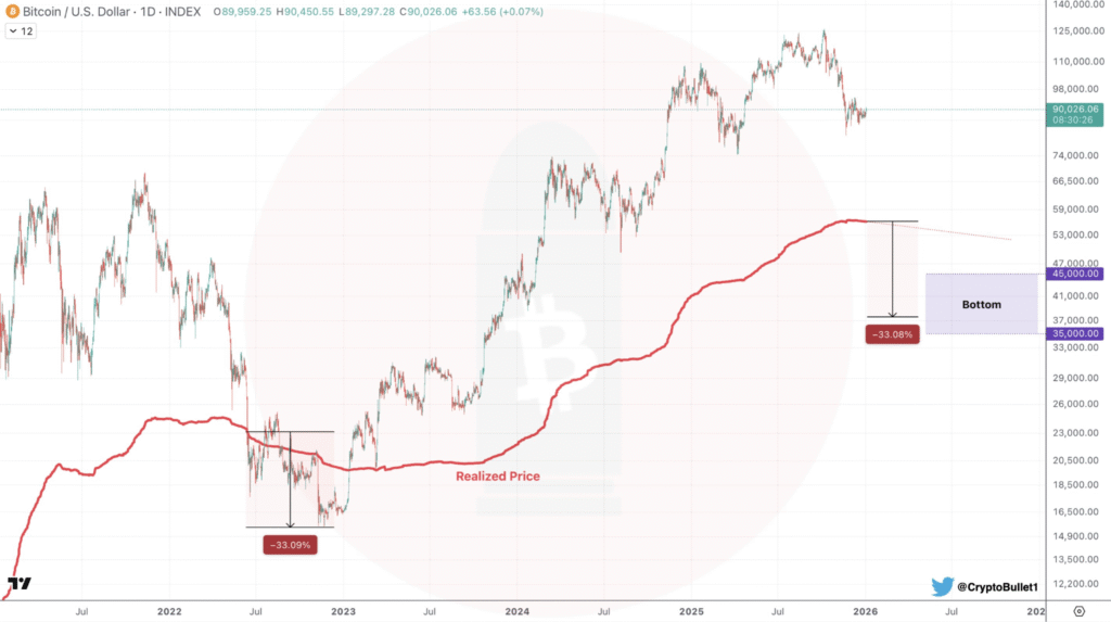 比特币已实现价格预示2026年市场或下跌33%