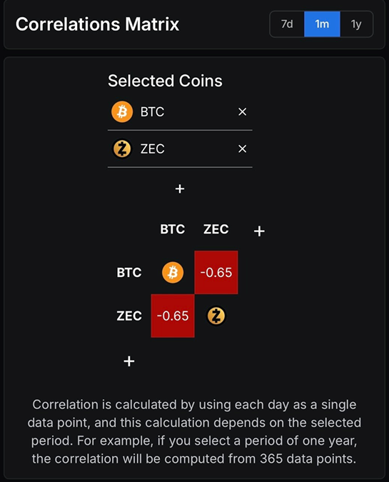 Zcash与比特币的月度皮尔逊相关系数达-0.65(该指标范围-1至+1)。