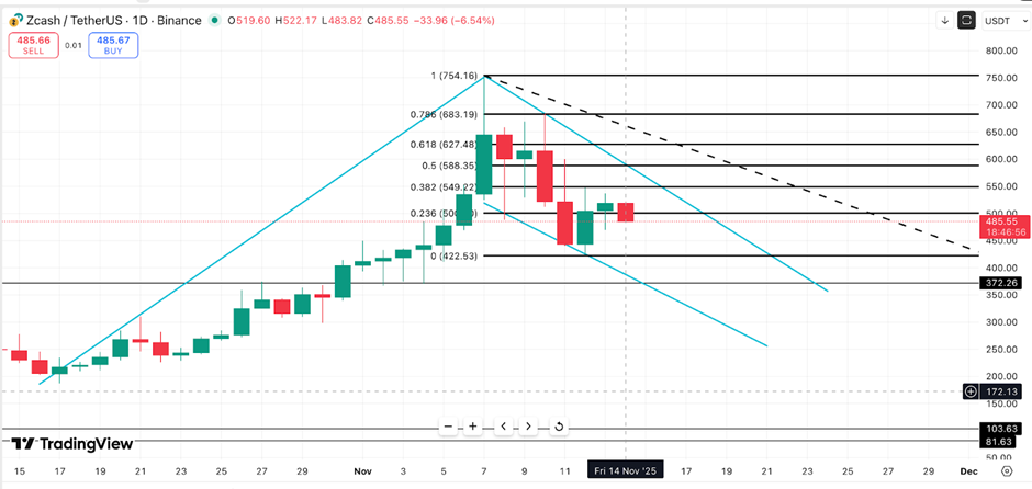 若跌穿422美元支撑位,则技术形态失效。这种负相关性结合看涨形态,解释了为何Zcash能在弱势市场中走出独立行情。