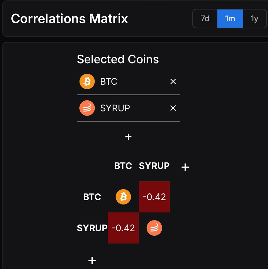 SYRUP与比特币月度相关系数为-0.42,月度数据能有效过滤短期波动噪音,更准确反映其与大盘的反向关联。