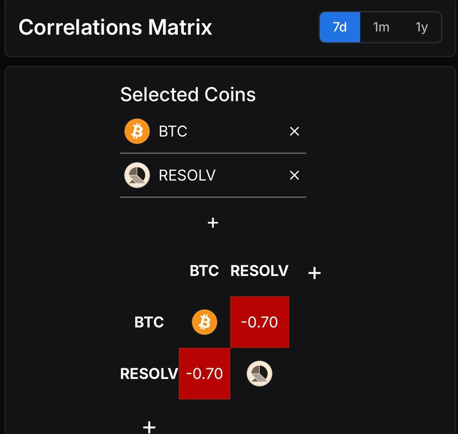 RESOLV与比特币周度相关系数达-0.70,该短期指标有效捕捉其对市场波动的快速反应,使其在大盘调整期逆涨97.27%。