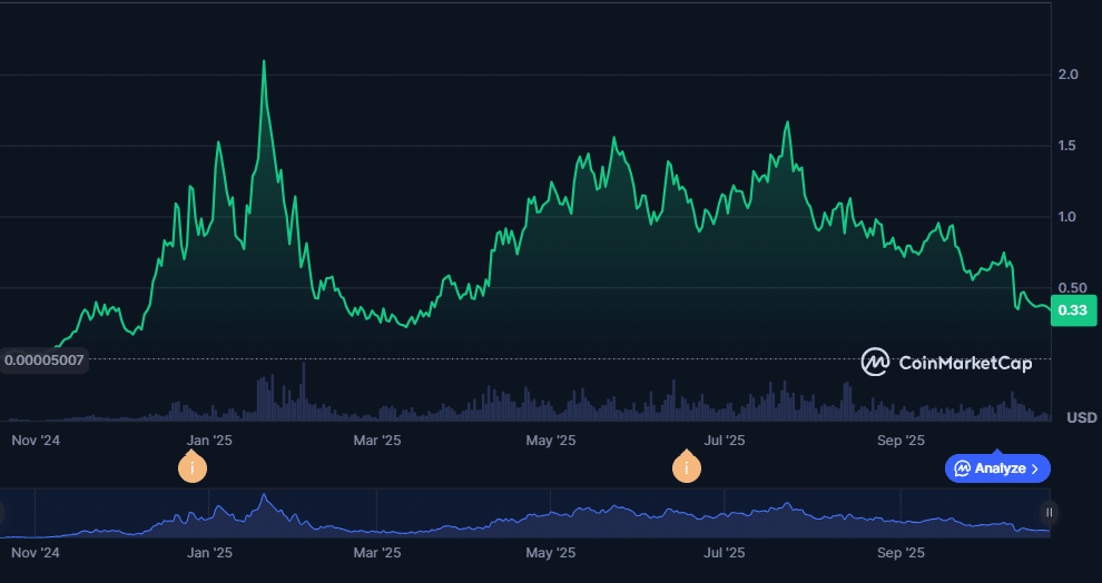 作为最新病毒式传播的焦点,Fartcoin代表着加密文化中幽默驱动的一面。当前价格0.3232美元,市值3.23亿美元,24小时交易量1.097亿美元。该代币在24小时内下跌14.5%,过去一周跌幅17.6%,经历近48%的月度回调。尽管遭遇挫折,其一年涨幅仍达惊人的732%。自2024年10月历史低点0.0000047美元以来,累计涨幅已达648,000%。