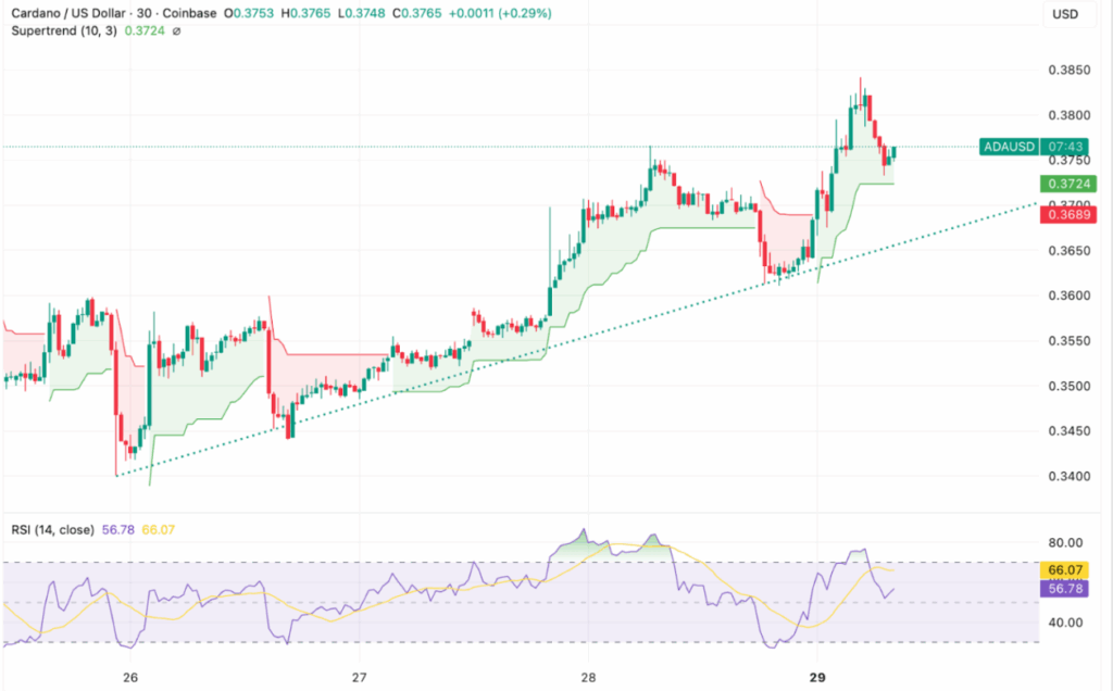 在30分钟图等更短时间框架上,ADA突破了0.372美元附近的短期超级趋势指标,并维持在上升趋势线上方。相对强弱指数(RSI)回升至55中轨区域,显示动能改善且未进入超买状态。