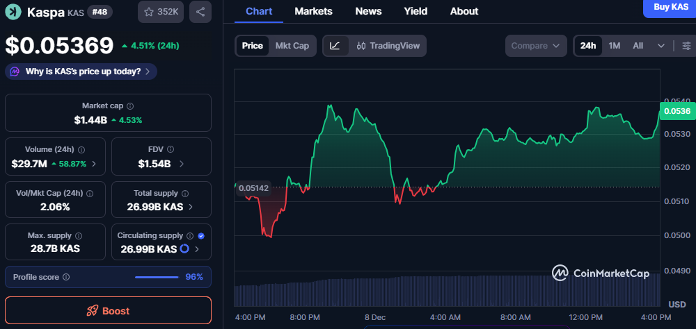 过去24小时内,Kaspa(KAS)价格上涨4.51%,达到0.05369美元,价格在0.0512美元至0.0536美元区间波动,呈现稳健且积极的市场态势。当前市值达14.4亿美元,反映出交易者和投资者日益增长的兴趣。
